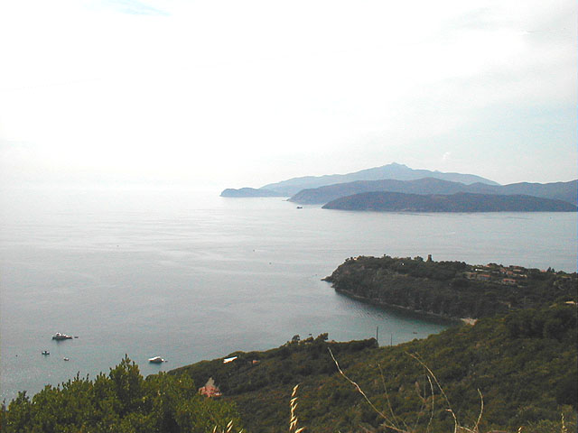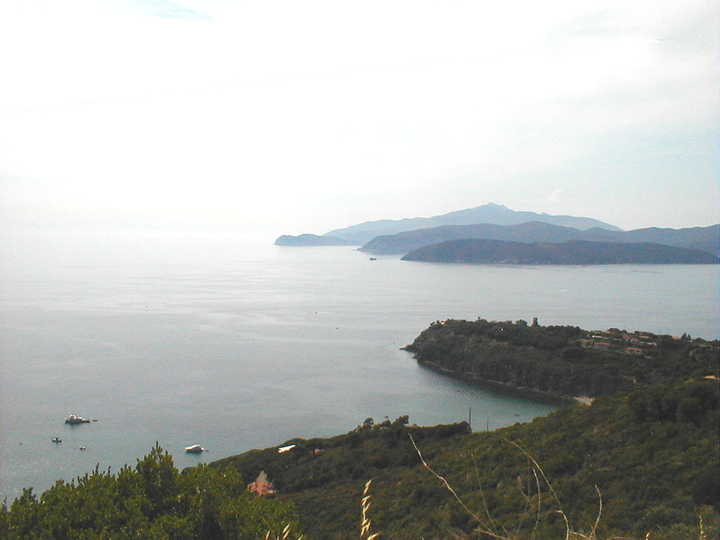 Rechts im Bild die Bucht von Morcone, im Hintergrund die drei großen Landzungen im Süden Elbas. Der Blick geht geradewegs nach Westen. Wäre es nicht so diesig gewesen, hätte man eventuell Korsika mit im Bild gehabt.