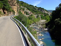 Anschließend geht es auf 2 Fahrspuren und gutem Asphalt durch zwei Schluchten. Die Straße befindet sich nicht weit vom Fluß entfernt, überquert ihn desöfteren auf kleinen Brücken. Die Felswände ragen bis zu hundert Meter in die Höhe. Ist die eine Schlucht bewältigt, wird kurz der Ort Salvatierra de Escá durchfahren und schon ist die Nächste voraus zu sehen.