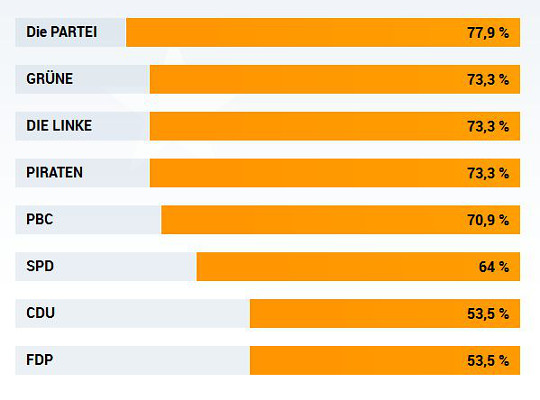 PBC schalte ich spaßeshalber häufig als Vergleich mit dazu, leider ist dann kein Platz mehr für die NPD (im Resumee sind nur begrenzt Parteien möglich). Wäre schon interessant, wo die relativ zu CDU und FDP stehen würde.