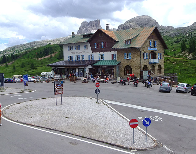 Blick von der Seilbahnstation auf die Kreuzung der Passhöhe, und das große Restaurant.