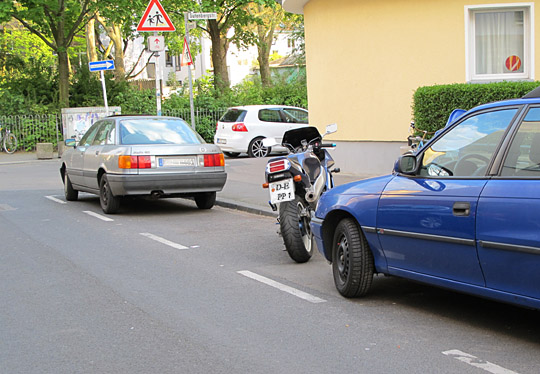 Und auf gar überhaupt keinen Fall blockiere ich mit meinem Hobel einen Parkplatz. Wenigstens nicht in einer Gegend, in der ein mickriger Parkplatz auf drei angemeldete Autos kommt. Gut, handelt es sich um eine 2 Meter breite Harley, die auseinanderfällt sobald ein Dackel dran vorbeiläuft, dann hätt ich vielleicht noch Verständnis. Aber eine billige, schmale Vierpfeifen-600er, die man an jede Hauswand lehnen kann? Wie gerne hätte ich eine gerade absteigende Rotznase dieser Art Mal vor mir, wenn ich in meinem Fiesta die dritte Runde um den Block drehe, um einen halbwegs legalen Parkplatz zu finden. Den Kerl würde ich sofort aus der Parklücke ziehen, Biker-Kollege hin oder her, wäre mir völlig Wurscht.