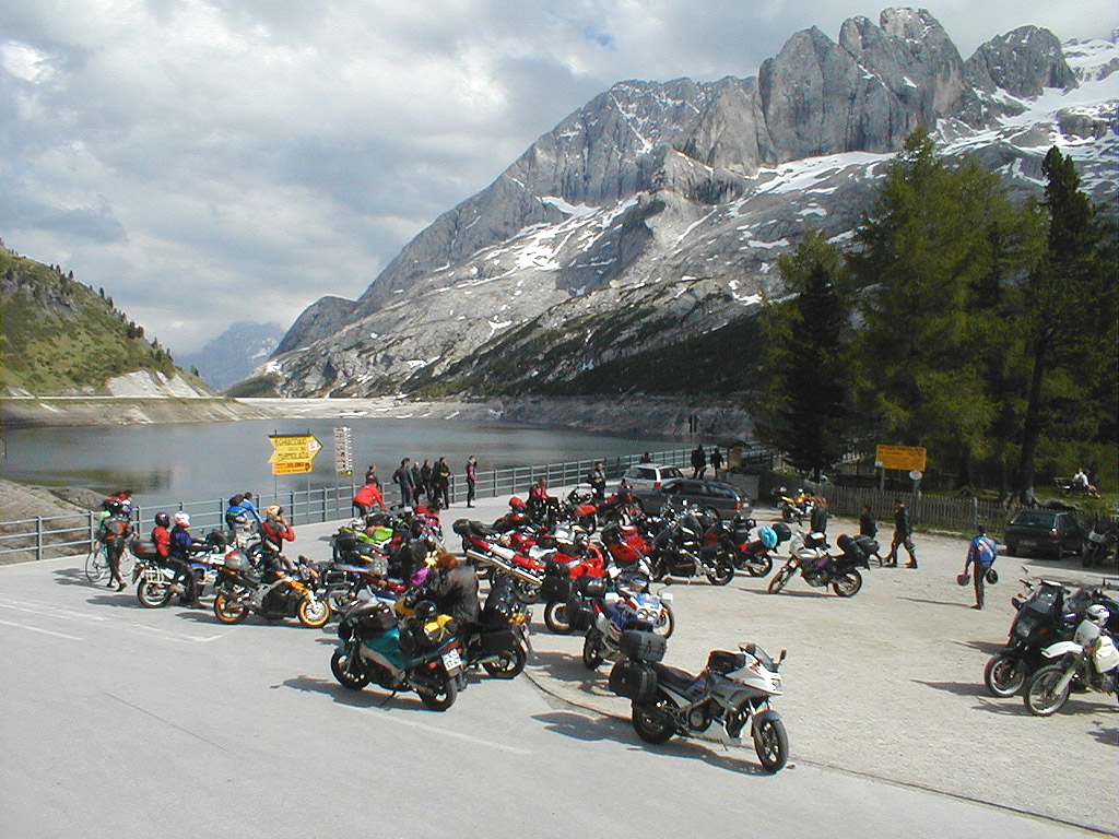 Die Passhöhe des Passo Fedaia, bei sonnigem Wetter und gut besucht.