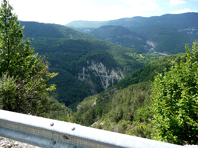 Je weiter man die Félines-Nordrampe bergab fährt, umso tiefer kann man in die Schlucht sehen. Häufig ist auch ein Teil der D610 zu sehen, die auf der anderen Schluchtseite verläuft.