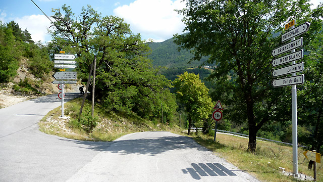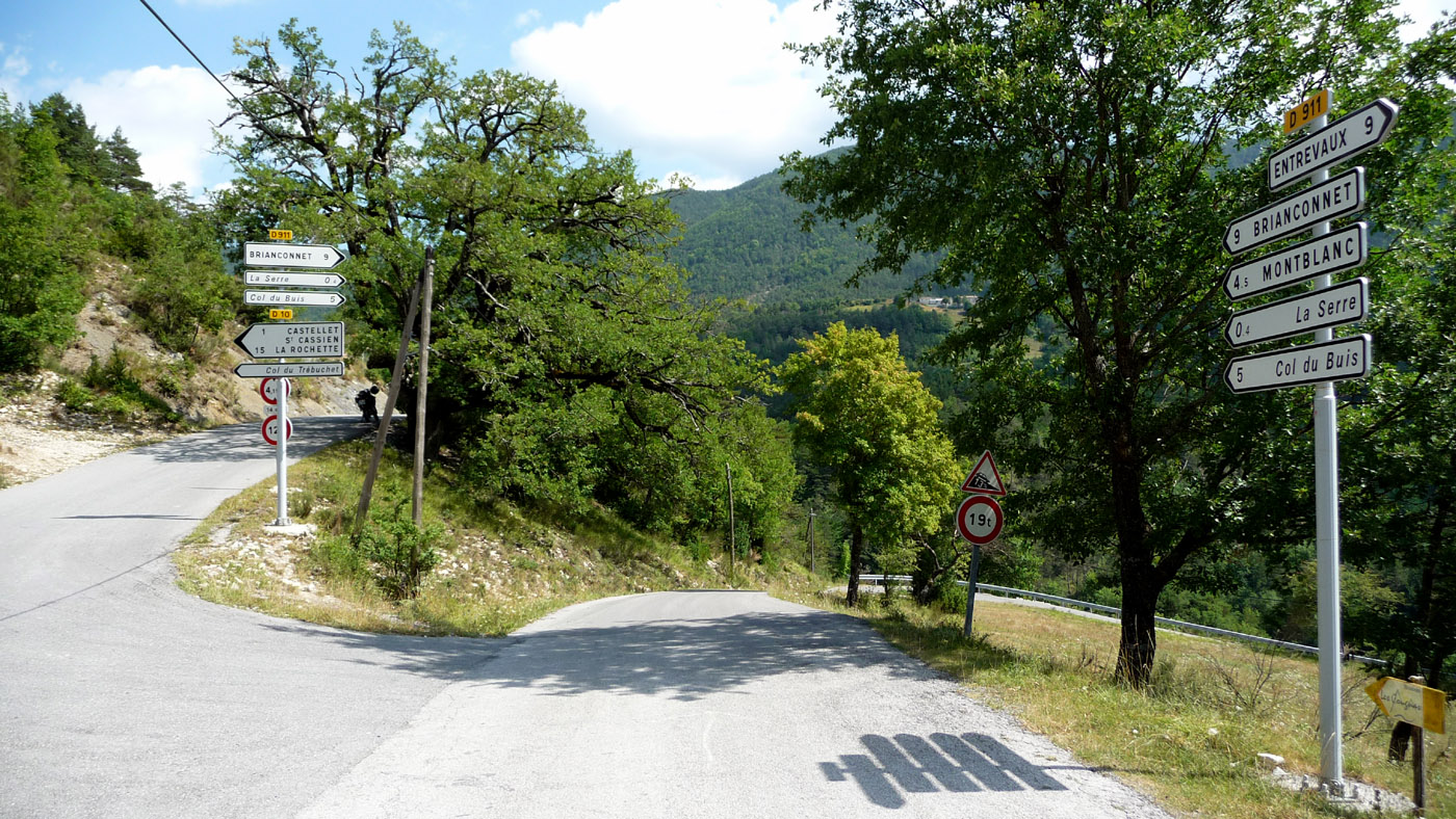 Rund 10 Höhenmeter über dem Ort La Serre, an dem die Félines-Südrampe endet, erscheint diese Kreuzung. Nach Osten (hier links) geht es hoch zum Trébuchet, der mit einer teilweise sehr schmalen Straße daher kommt.