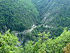 Auf der weiteren Fahrt geht es mal durch nicht allzu hohen Wald, mal durch etwas freiere Fläche. Dabei ist die Straßenführung immer sehr kurvig und mit vielen engen Kehren gespickt, längere Geraden wie die im Bild zu sehende sind eher selten. Sehr nett zu fahren, leider bekommt man die Schlucht nicht mehr zu sehen, was wenigstens ich mir schon etwas erhofft hatte.