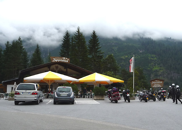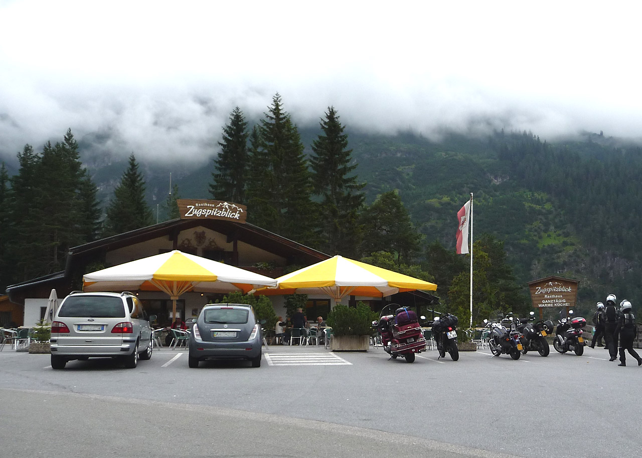 Kurz unterhalb der Passhöhe befindet sich das Restaurant Zugspitzblick. Scheinbar hat man von der Terasse aus einen schönen Blick auf die Zugspitze (die in der anderen Richtung liegt), aber dieser war mir an dem Tag nicht vergönnt. Rechts außerhalb des Bildes liegt der Blindsee, den man bei jedem Wetter sehen kann.