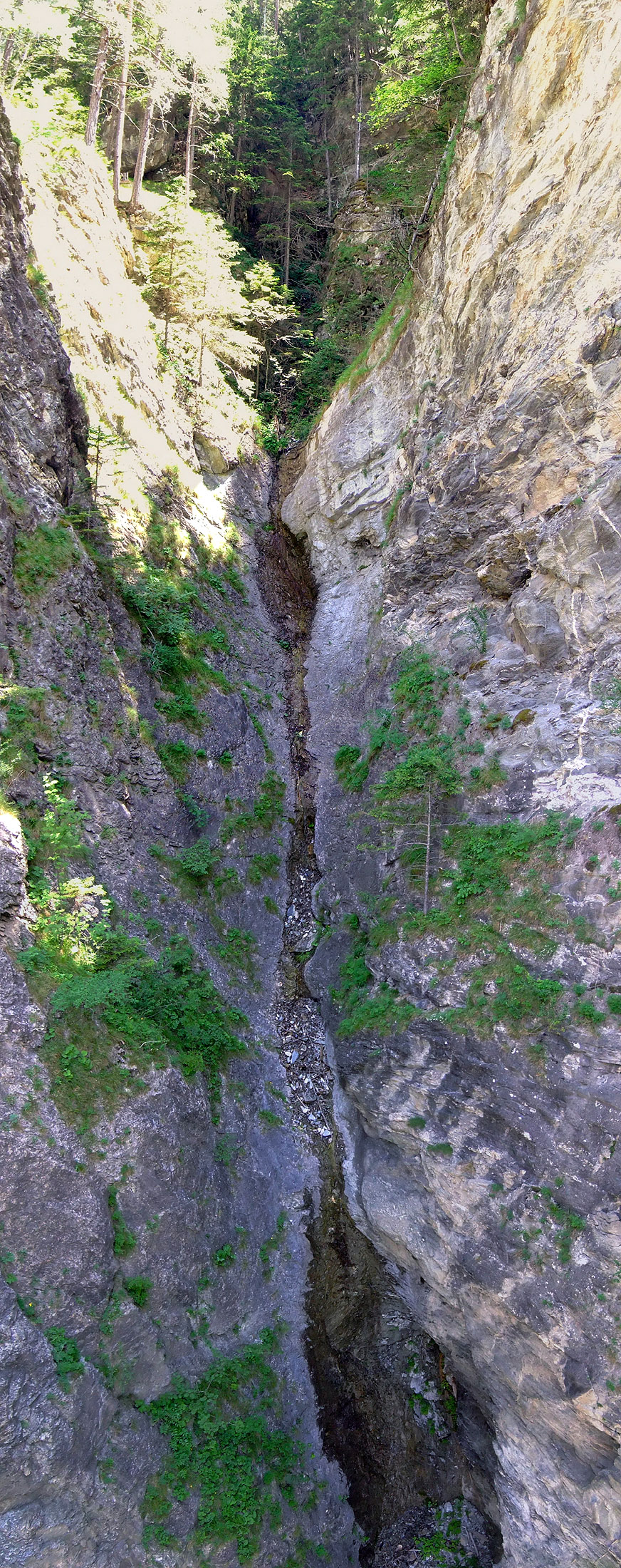 Kurz vor der Raststelle auf der Nordrampe liegt eine kleine Brücke. Diese führt über einen Bergeinschnitt, indem ein Gebirgsbach seine steile Reise in die Tiefe aufnimmt. Das Hochkant-Panoramabild besteht aus 4 übereinandergesetzte Aufnahmen.