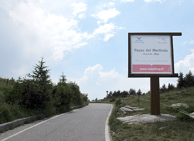 In Sichtweite zum Passschild des Passo della Foppa, das links über der Straße teilweise zu erkennen ist, steht noch ein weiteres, das den Passo del Mortirolo ausweist, der aber nicht wirklich an der Stelle zu finden ist.