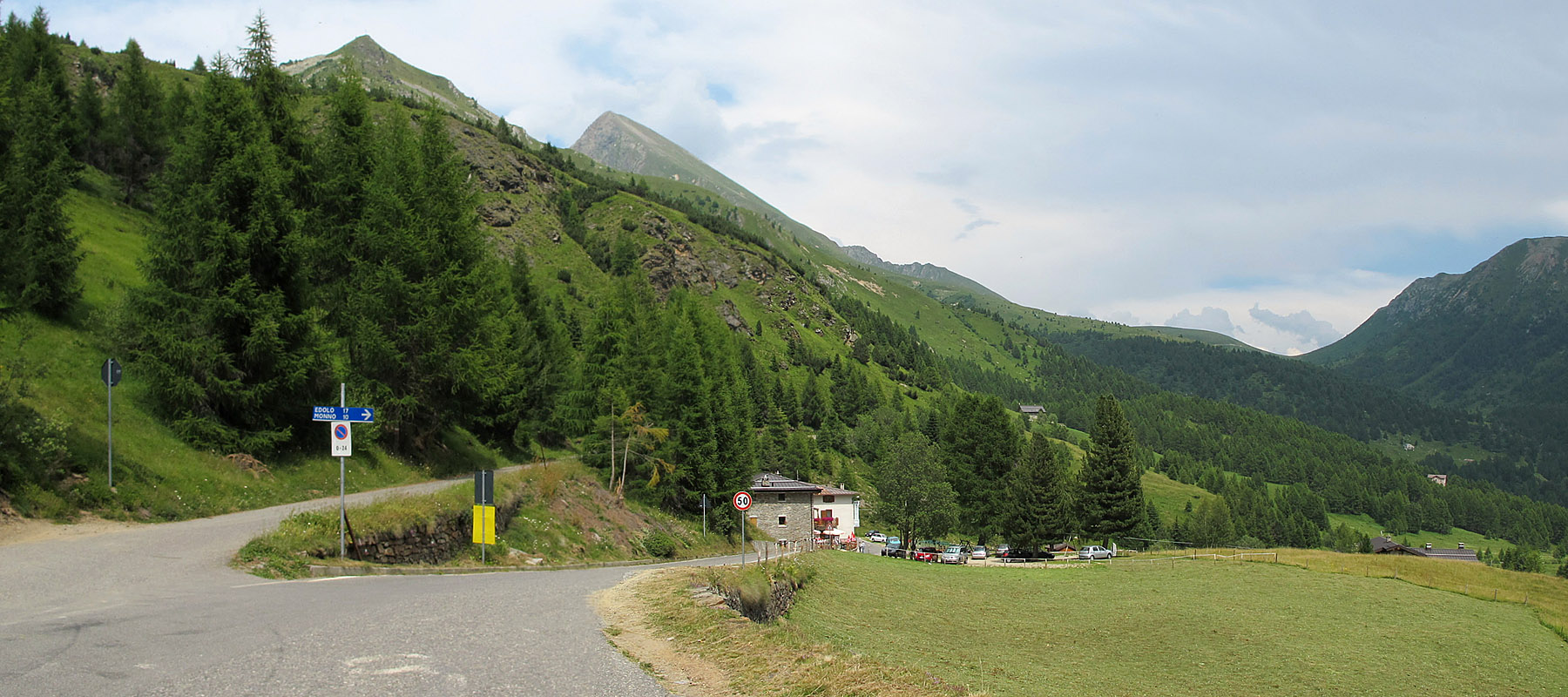 Auf der Südrampe, rund 500 Meter von der Foppa-Passhöhe entfernt, liegt diese Abzweigung. Auf anfangs mäßigem Asphalt führt sie nach Osten und zuerst über den Passo di Varádega, später auf Schotter Richtung Col die Val Bighera. Wenn meine Recherche richtige Ergebnisse geliefert hat, geht nach wenigen hundert Metern eine Straße nach Norden ab, wo dann eventuell die Passhöhe des Mortirolo liegt.