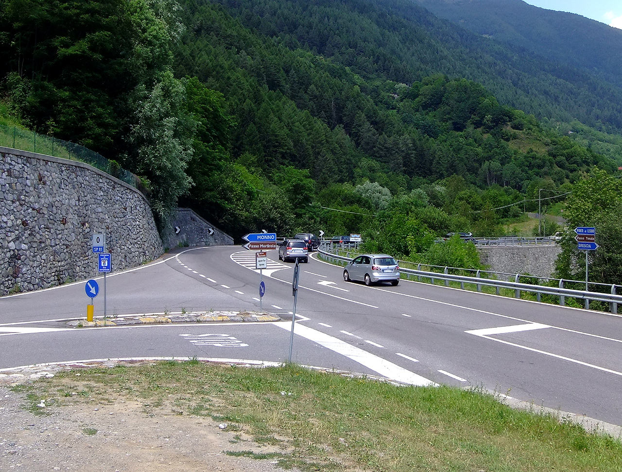 Die breite Hauptstraße ist die SS42, in Blickrichtung geht es zum Passo del Tonale. Links ist die Einfahrt des Passo della Foppa zu sehen, der aber nicht als solcher ausgeschildert ist. Nur auf den Ort Monno und den Passo del Mortirolo wird in der Mitte der Kreuzung hingewiesen.