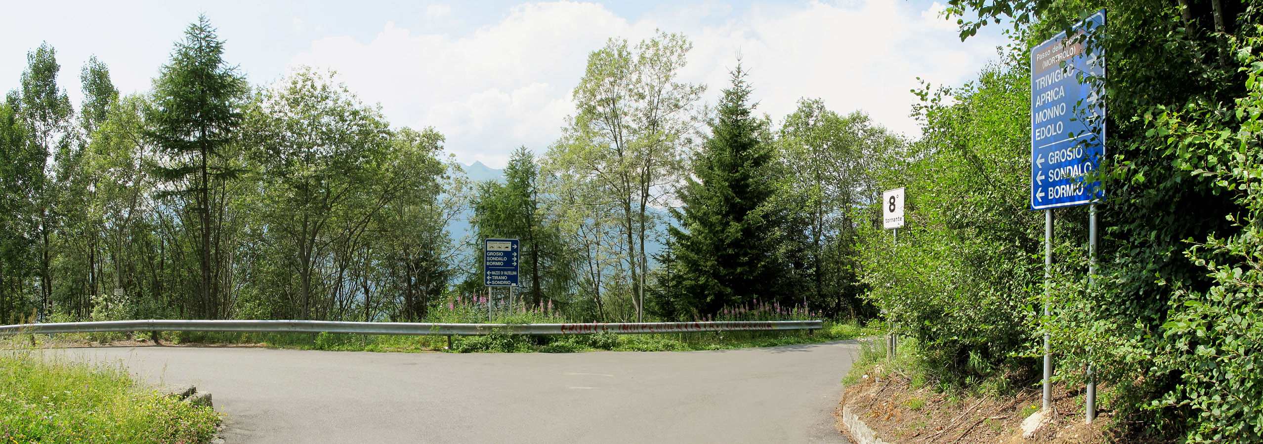 Kommt man von der Passhöhe und fährt bergab, taucht diese Kreuzung nach 3 Kilometern Fahrt auf. Der Weg links führt auf extrem kehriger Strecke nach Mazzo di Valtellina, der rechte endet etwas weiter nördlich in Grosio.