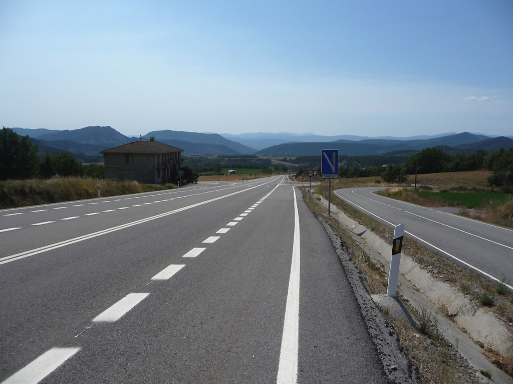 Die Westrampe des Collado de Foradada, der Blick geht ins Tal. An dieser Stelle hat man herrliche Aussicht auf das Bergmassiv Serra Ferrera, das häufig von Hindernissen oder anderen Hügeln halb verdeckt wird.