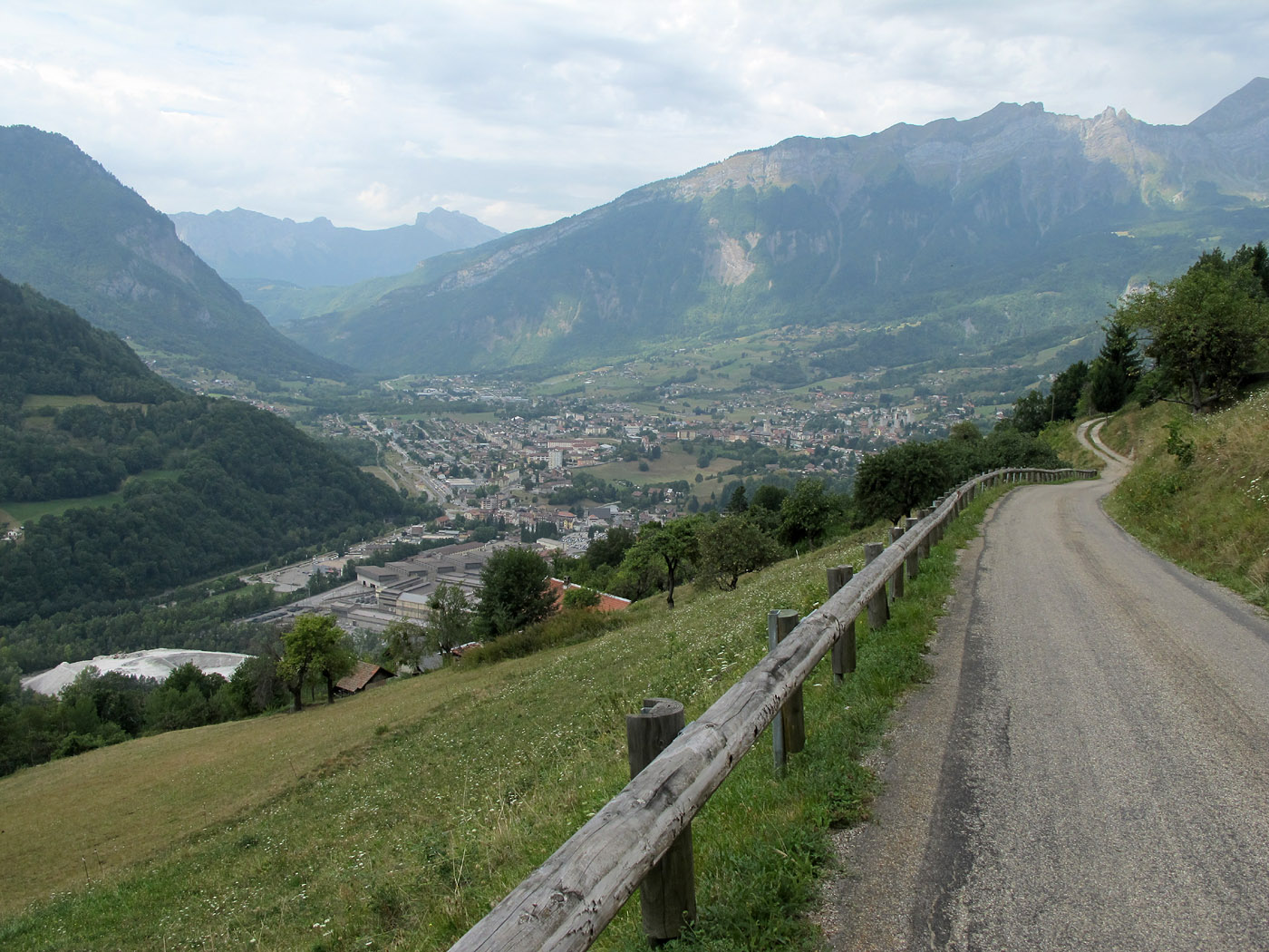 Auf den untersten Kilometern hat man von der Nordrampe gute Sicht auf das im Tal liegende Ugine. Der Bergeinschnitt links im Bild führt nach Annecy, in dessen Nähe ein weiterer Col de la Forclaz zu finden ist.