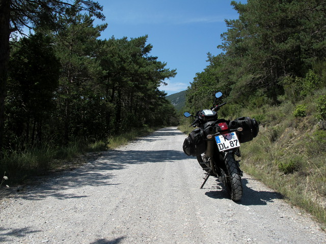 Feiner Schotter auf festgefahrenem Untergrund, die Piste meist 1,5 Spuren breit.