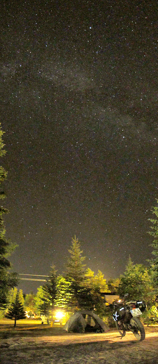Ein Hochkant-Panoramabild aus drei 30-sekündigen Aufnahmen mit 1.600 ASA. Bike ist drauf, Zelt ist drauf, die Milchstraße inklusive dem Sommerdreieck, das nach unten rechts zeigt. Traumhaft, wenigstens aus meiner Sicht.