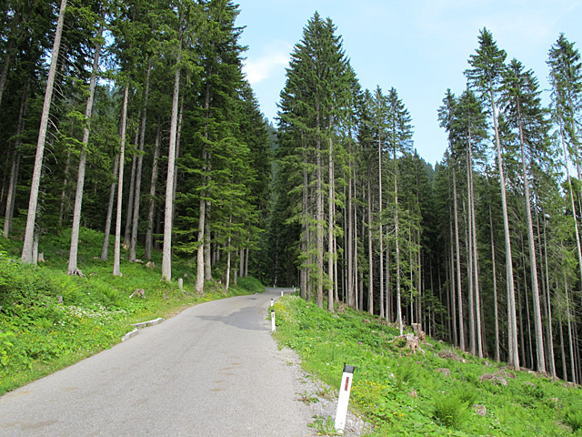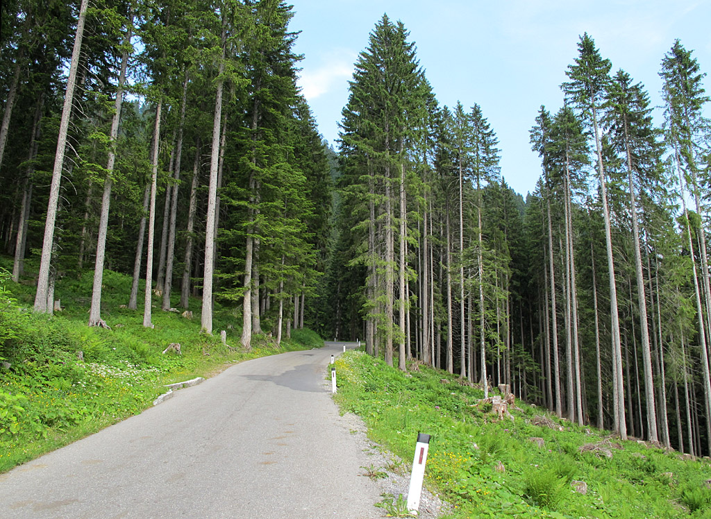 An manchen Stellen der Westrampe erinnern die hohen Nadelbäume