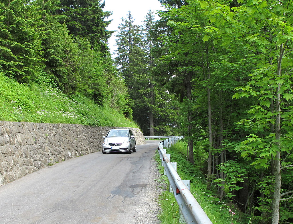 Oberhalb der Bädle Hütte ist die Straße zwar schmal (und oft geflickt), aber wegen fehlender Ausweichmöglichkeiten doch breit genug, das zwei Autos so gerade eben aneinander vorbeifahren können.