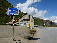 Die Passhöhe ist etwas in die Länge gezogen. Direkt am Passschild der Westseite gibt es einen Parkplatz und ein baufälliges Gebäude. War es mal ein Hotel, dann hat es seine Hochzeiten definitiv hinter sich. Etwas weiter östlich steht das Hotel Furkablick, das zwar mehrere Gebäude für Urlauber bereithält, aber laut Internetrecherche eventuell bis auf weiteres geschlossen ist.