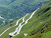 Hinter Realp, das bis zum Ende der Passfahrt der letzte Ort auf der Strecke ist, fängt der schöne Teil der Überfahrt an. Auf mehreren Kehren und Kurven geht es auf unterschiedlich breiter Piste den Berg hinauf, Realp selber liegt dabei noch lange Zeit in Blickweite.