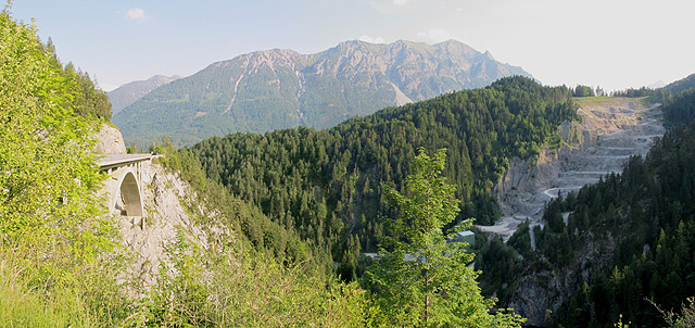 Links ist die Brücke zu sehen, die von der Passhöhe auf die Ostrampe führt.