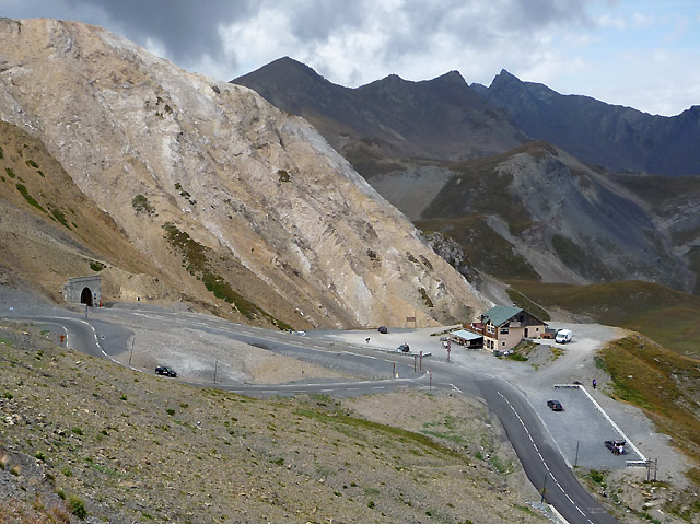 Direkt unterhalb der Passhöhe befindet sich auch auf der Nordrampe eine Unterkunft. Links ist die nördliche Tunneleinfahrt zu erkennen, ins Tal führt die Straße unten im Bild.