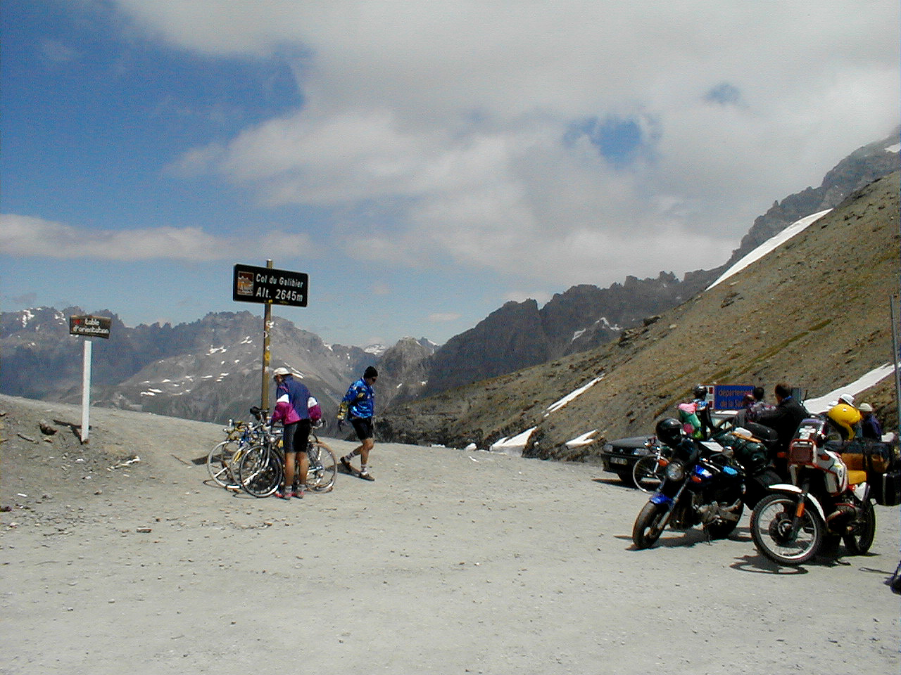 Die Passhöhe des Col du Galibier(i) kommt sehr bescheiden daher: Passschild, kleiner Parkplatz, Ende. Jedoch gehts per Pedes noch rauf auf die Aussichtsplattform. Das Bild wurde im Jahr 1999 aufgenommen, als der Parkplatz noch nicht von Abgrund und Straße abgetrennt war.