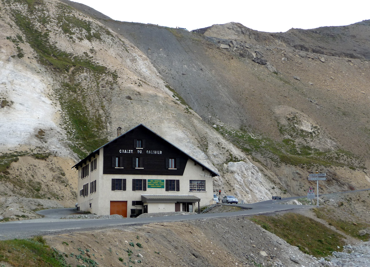 Auf der Südrampe, kurz unterhalb der Passhöhe steht das Chalet du Galibier. Die Passhöhe ist oben am Bildrand zu sehen, die südliche Tunneleinfahrt befindet sich wenige Meter links außerhalb des Bildes.