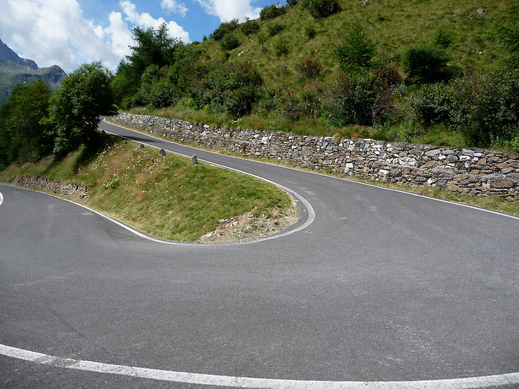Eine der vielen Kehren im Mittelteil der Gavia-Südrampe. Wie man gut sehen kann, der Asphalt ist bestens in Form.