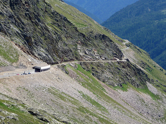 Der Tunnel auf der Südrampe, fotografiert von vielleicht einem Kilometer Entfernung. Die um den Tunnel herumführende Schotterstrecke ist gut zu erkennen. Das Stück Straße rechts oben am Berg gehört aber wieder zur asphaltierten Hauptstrecke, die südliche Einfahrt des Tunnels ist aus dieser Richtung nicht zu sehen.