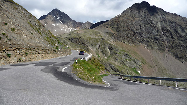 Im oberen Teil der Südrampe wird der Belag wieder etwas anstrengender und die Umgebung neben der Straße rauher und felsiger.