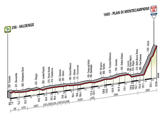 15. Etappe am 25. Mai wird wieder interessanter. Nach 197 Kilometern Flachland finden die letzten 20 Kilometer im Anstieg hoch zum