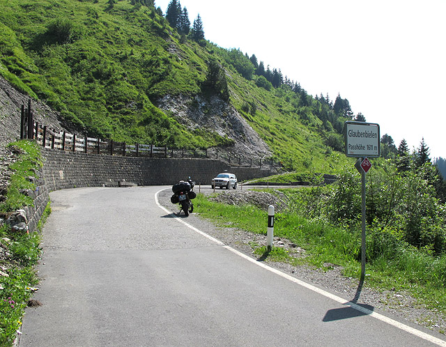 Blick auf die Passhöhe des Glaubenbielen, von den letzten Metern der Ostrampe aus aufgenommen. Rechts ist ein kleiner Parkstreifen zu erkennen, ansonsten gibt es auf der Passhöhe nicht viel zu sehen. Außer noch das Feld der Gerölllawine, die sich hin und wieder von links nach rechts über die Passhöhe zu wälzen scheint.