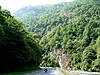 Von Norden kommend liegt die Straße zuerst neben einem Fluß und auf seiner Höhe. Sympatische Kilometer, gleich neben dem Mäuerchen den blau-grünen Fluß zu sehen ist irgendwie entspannend. Auf meist weiten Kurven und in dicht bewaldeter Gegend wird die Schlucht langsam immer Tiefer, die neben der Straße aufragenden Wände steiler. Sehr auffällig sind kurz vor dem höchsten Punkt die Steinschlaggitter, die quer über die Straße hängen, wie eine preiswert improvisierte Galerie. Habe ich in der Art selten woanders gesehen, besonders in dieser stabilen Bauform.