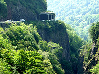 Es geht stetig nach oben, der Fluß entfernt sich immer weiter vom Verkehr. Richtig beeindruckend ist die Schlucht im steilsten Bereich, wo die Schluchtwand geschätzte hundert Meter senkrecht in die Tiefe fällt. Zwei Galerien wurden an den besonders heiklen Stellen gebaut, in denen sich die Straße etwas verengt auf den Verkehr geachtet werden sollte. Ganz besonders auf Radfahrer, die in dem Gebiet vermehrt unterwegs sind und entsprechend häufig von Autos überholt werden. In diesem Teilstück gibt es mehrere Haltebuchten am Straßenrand, von denen aus der Anblick nach oben und unten in Ruhe genossen werden kann.
