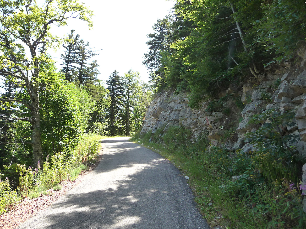 Im mittleren und oberen Bereich der Nordrampe fährt man desöfteren an felsigen Wänden entlang. Diese sind dicht bewachsen und die Wurzeln der Bäume scheinen den Fels nach und nach zu zerkleinern, so dass er immer bröckliger wird und irgendwann abrutscht.