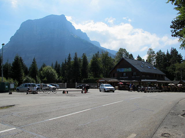 Auf der Passhöhe des Col du Granier(i) steht ein gemütliches Restaurant, bei schönem Wetter gleichgesinntes Publikum inklusive. Im Hingergrund ist der Mount Granier zu sehen, dessen Nordflanke senkreicht wie eine Hauswand abfällt.