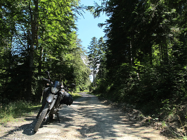 Aus dem Wald kommt man kaum heraus, für gewöhnlich ist es ringsherum toll grün. Die Piste ist dabei selten breiter als im Bild zu sehen, der Belag nur an wenigen Stellen ein bisschen schwerer zu fahren.