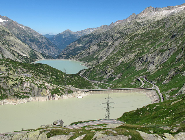 Beide Seen (Grimselsee vorne, Räterichsbodensee hinten), und beide Staumauern auf einen Blick. Die Nordrampe führt rechts an den Seen vorbei Richtung Tal nach Innertkirchen.