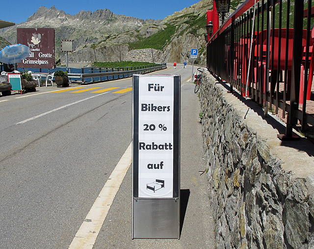 2010 stand vor dem Hotel Grimselblick dieses Schild, das Bikern 20 Prozent Rabatt androhte. Ausprobiert habe ich es nicht, nehme aber stark an, das es nur für Übernachtungen gilt, und nicht auch für das abendliche Futter.