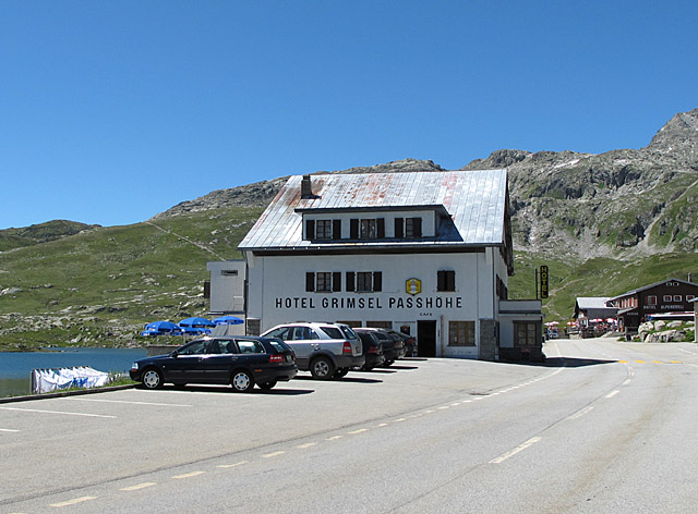 Das weiße Gebäude links ist das Hotel-Restaurant Grimselpass, das direkt am Totensee liegt.