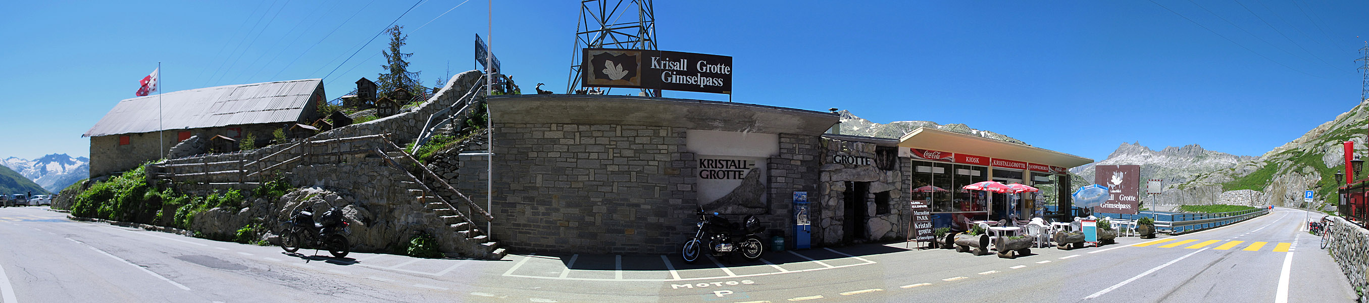 Im Rücken befindet sich das Hotel Grimselblick, die Straße links führt auf die Südrampe, die rechts zum Nordteil der Passhöhe. Gleich voraus sind die Eingänge zur Kristallgrotte und dem Murmeltierpark zu finden.