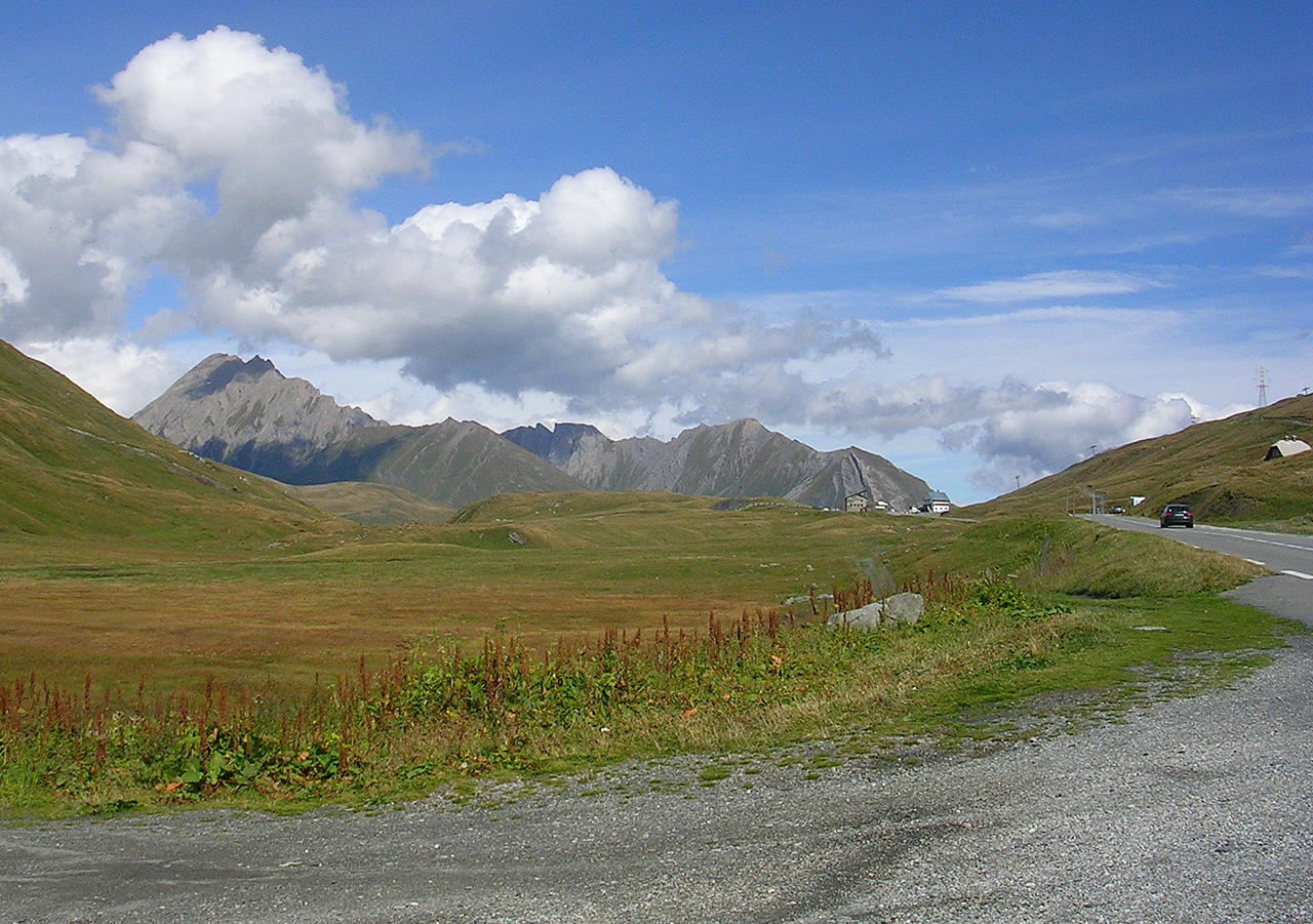 Die Aussicht auf das umliegende Bergland am Großen St. Bernard. Fotografiert wurde von der südlichen, italienischen Passhöhe, rechts im Bild ist die nordliche, schweizer Passhöhe und die Grenzstation zu erkennen.