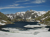 Die Passhöhe ist dann zweigeteilt. Auf der etwas tieferen, italienischen Seite sticht als erstes der See ins Auge, der bei meiner Überquerung 1999 etwa angefroren und schneebedeckt war. Darüberhinaus liegt dort ein großer Parkplatz für Busse und Autos.