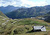 Kurz unterhalb der Passhöhe liegt die italienisch-schweizer Grenze, ein kleiner Bergsee und ein Parkplatz.