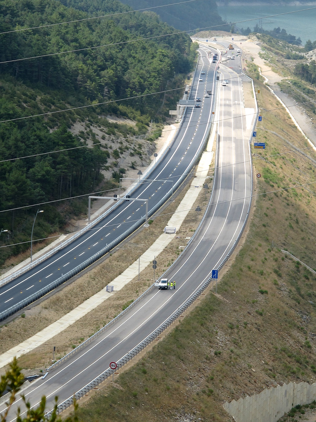 Blick auf die Südrampe des Monrepos(i), dessen Fahrbahn auf beiden Seiten in eine Autobahn verwandelt wird. Baustellen waren 2014 überall zu sehen, wie auch unfertige oder noch nicht in den Verkehr eingebundene Brücken. Rechts oben ist eine Ecke des Embalse de Arguis zu sehen. Erstellt wurde das Foto von der westliche Auffahrt hinein in die Sierra de Guara(i).