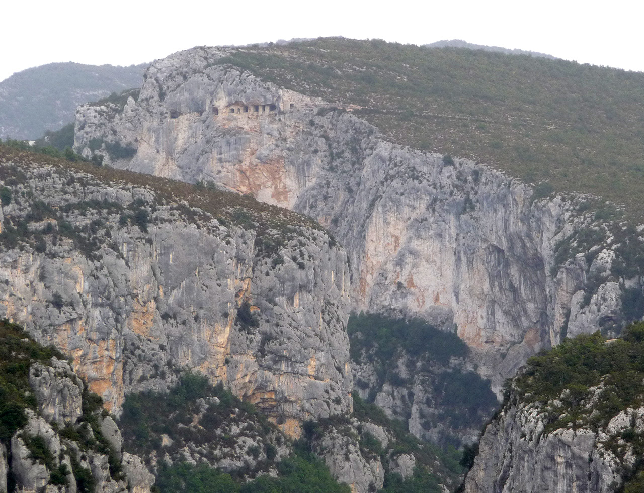 Blick auf die Tunnelanlage Tunnels du Fayet, die sich etwa in der Mitte des Col d'Illoire befindet. Aufgenommen wurde das Bild aus rund einem Kilometer Entfernung. Fährt man die Strecke von Westen nach Osten, wird man sich dem Tunnel wenige Minuten später auf der Straße nähern, die nach rechts aus dem Bild hinausläuft.