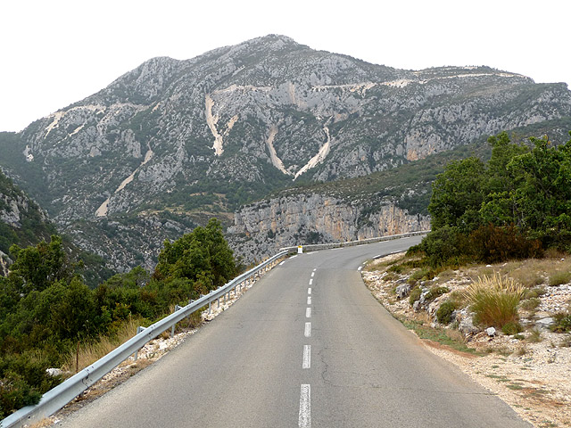 Im Berghant ist die Straße des Collet Barris zu erkennen. Aufgenommen wurde das Bild auf der Ostseite des Col d'Illoire, kurz vor dem Aussichtpunkt Balcons de la Mescla. Dieser ist so gerade eben nicht im Bild, wenige Meter rechts hinter den Bäumen beginnt die Treppe, die zu dem kleinen Balkon führt.