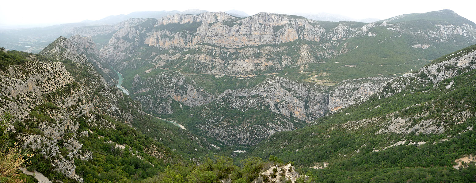 Kurz nachdem man auf der Westrampe des Illoire die ersten Blicke in die Schlucht werfen kann, zeigt sich dieses eindrucksvolle Panorama. Quer durch das Bild zieht sich die Ostrampe des auf der anderen Seite verlaufenden Col de l'Olivier. Dieser Bergkessel wird in Landkarten auch als Cirque de Vaumale bezeichnet.
