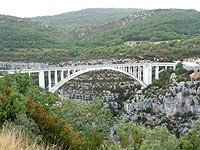 Ein weiteres Highlight der Strecke ist die kurz dahinter liegende Brücke Pont de l'Artuby, die sich wie ein Bau aus römischen Zeiten über einen Abzweig der Verdon-Schlucht spannt, der auch Canyon de l'Artuby genannt wird. Unter der Brücke fließt der namensgebende Fluß Artuby, der jedoch bei meinen bisherigen besuchen immer sehr ausgetrocknet wirkte. Das Bild links unten wurde vom Collet Barris aufgenommen, der sich auf der anderen Seite der Schlucht befindet.
