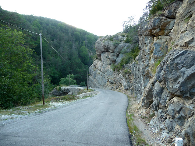 In dem asphaltierten Part der Iscle-Nordrampe wird es auf ein paar Metern etwas felsig am Straßenrand.